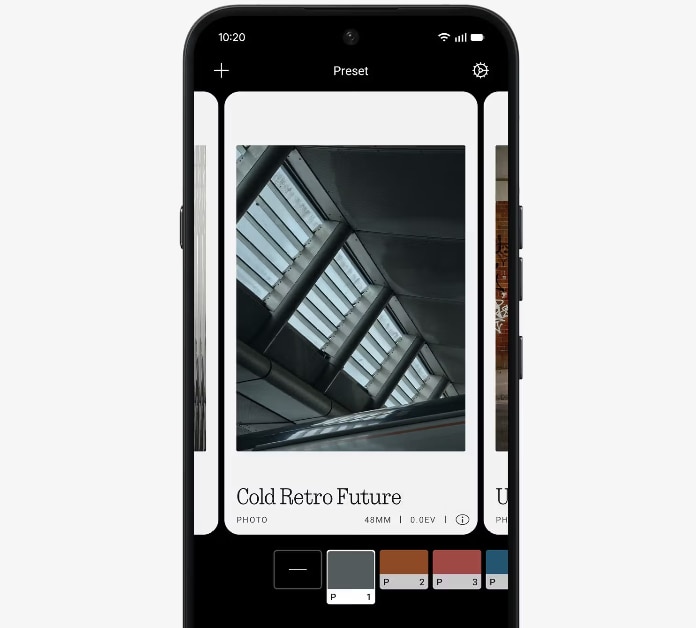 Reglati fin pana la 7 setari ale camerei ca un profesionist, fotografiati in format RAW pentru control maxim asupra editarii sau aplicati presetari predefinite create de fotografi din Nothing Community.